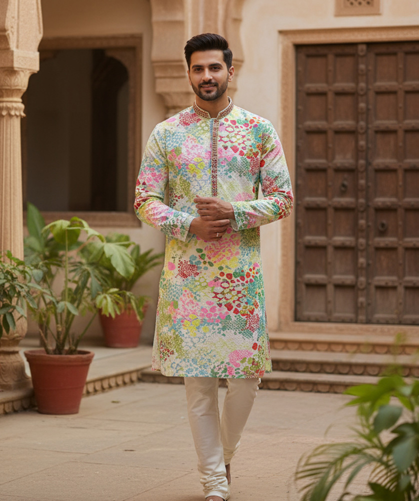 The distinctive feature is the detailed floral embroidery, predominantly on the bottom part of the kurta, adding a touch of traditional artistry and sophistication.