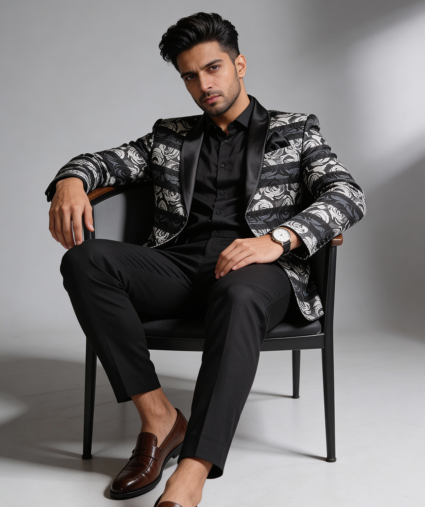 | Brand Name | Bluez | Product Attributes | Its rich texture and deep hue (or bold pattern) offer a regal, confident look that is perfect for cocktail parties, festive celebrations, or any event where you want to make an unforgettable impression. Pair it with dark trousers to let the jacket take center stage. |