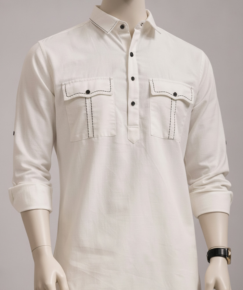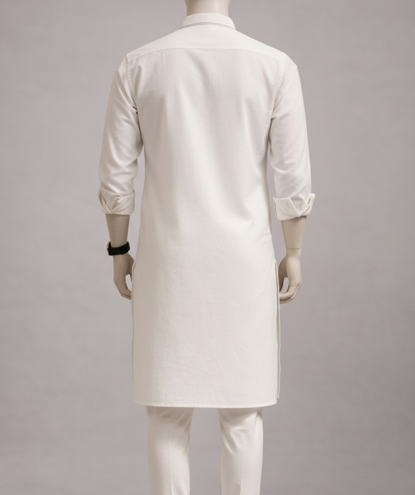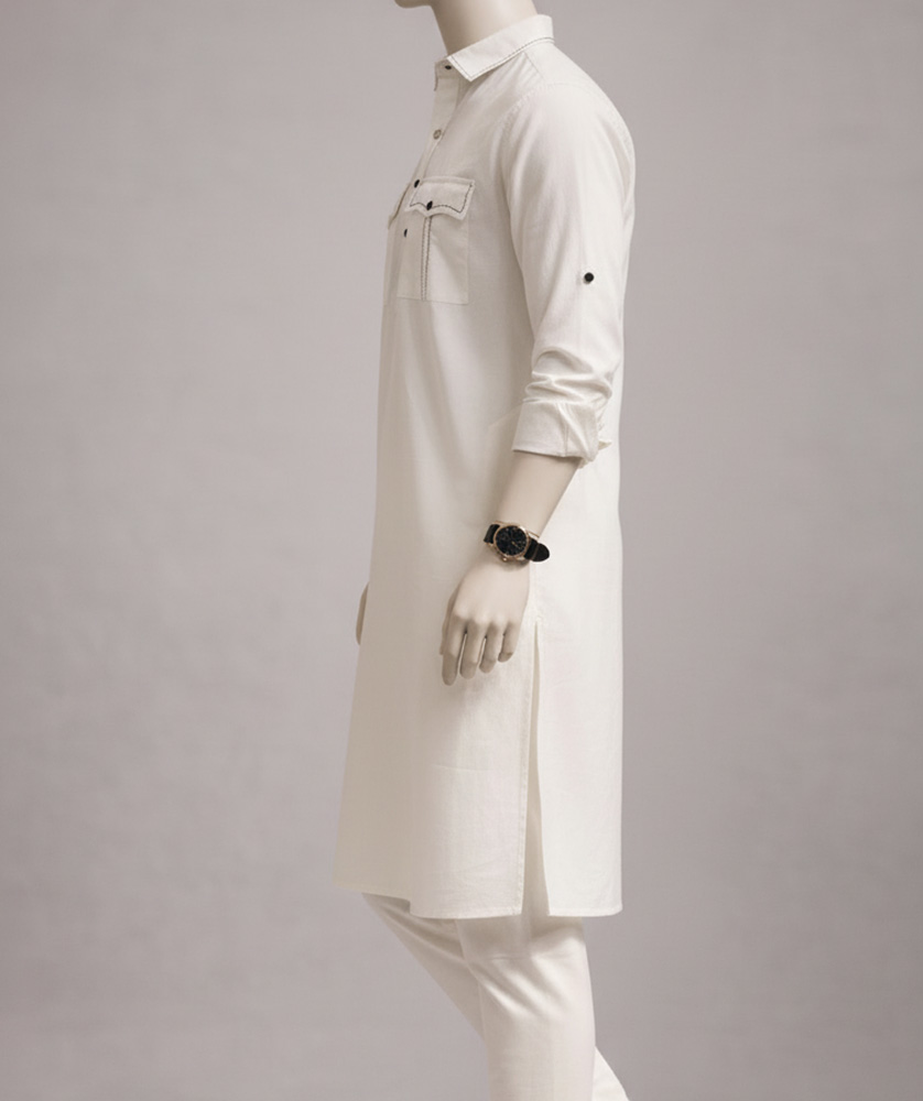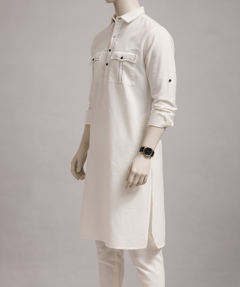 An elegant and luxurious pathani is lightweight, airy, and flowing silhouette.the kurta is a white-colored piece crafted from the finest cotton stain fabric ,giving it an elegant and festive appeal. The chest pockets on both sides, the collar & cuff have striking rich stich detailing.