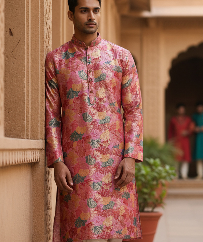 The distinctive feature is the detailed floral embroidery, predominantly on the bottom part of the kurta, adding a touch of traditional artistry and sophistication.