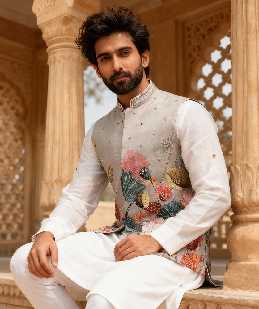 A classic combination of a kurta and a bandi, also known as a Nehru jacket which adds a formal and elegant touch to traditional dressing.