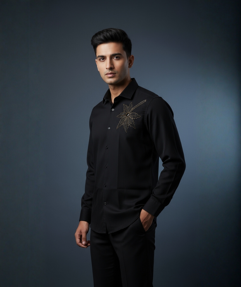 This black shirt features intricate gold-toned leaf embroidery on the left chest/shoulder area. The design is often described as a botanical, leaf, or sometimes abstract floral motif.