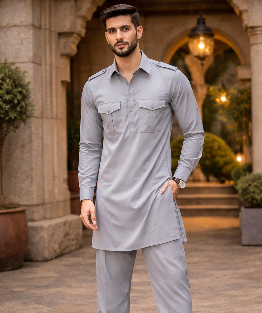 The two-pocket Armani Pathani (also known as a Khan Suit) is a premium take on the traditional Afghan-inspired ensemble, specifically characterized by its use of “Armani fabric”—a high-quality, often stretchable or “lachka” material that offers a more refined, contemporary drape compared to standard cotton.