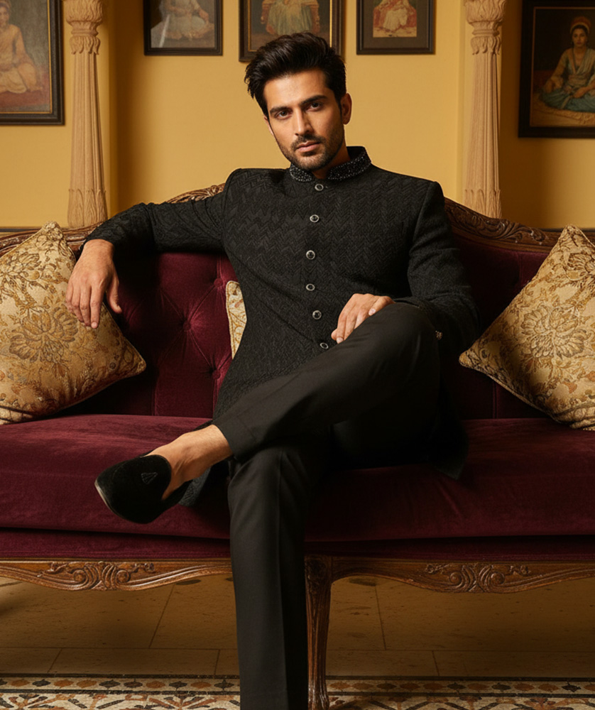 A style of fashion that blends traditional Indian elements with Western designs and silhouettes, featuring opulent embellishments like intricate embroidery, zardozi, sequins, or beads.