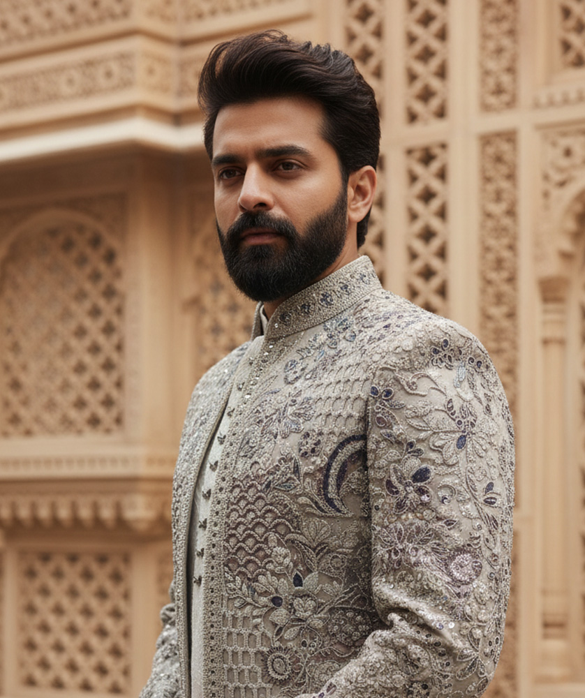 A style of fashion that blends traditional Indian elements with Western designs and silhouettes, featuring opulent embellishments like intricate embroidery, zardozi, sequins, or beads.