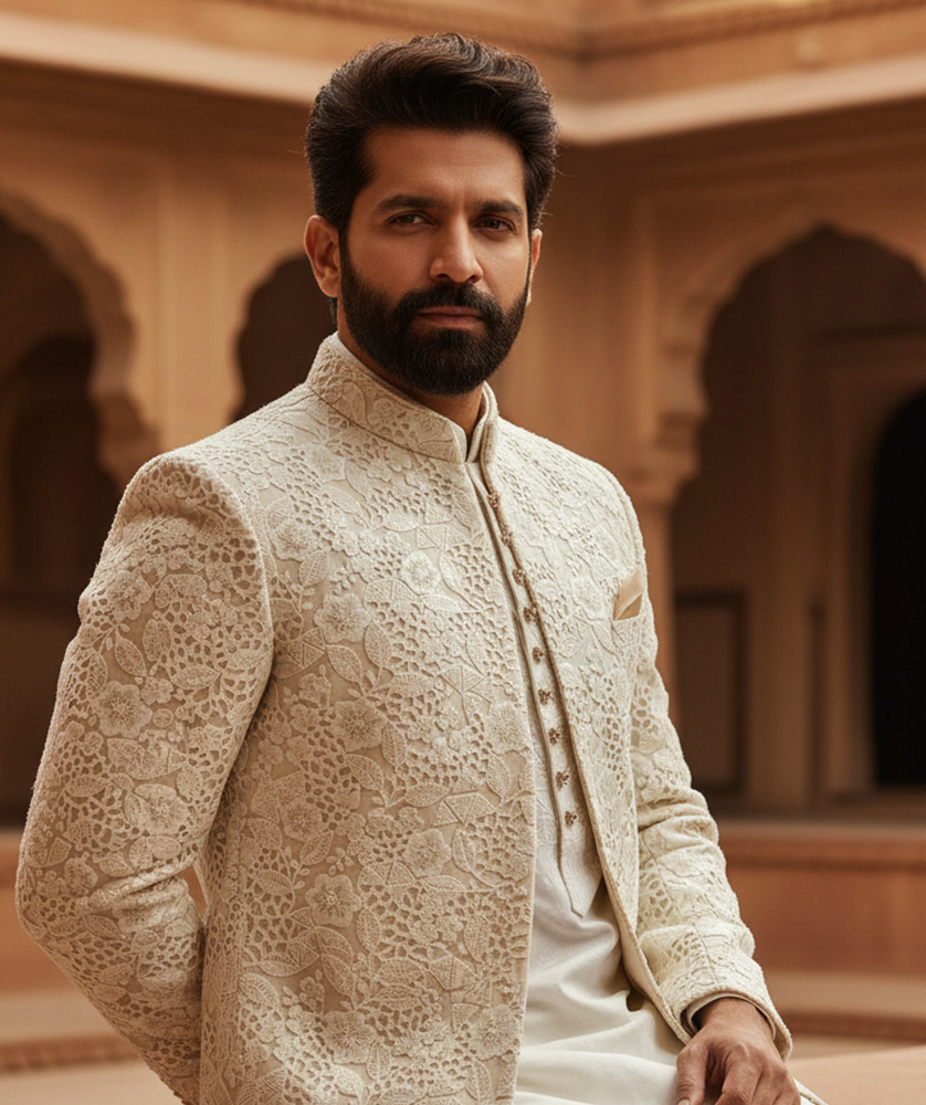 A style of fashion that blends traditional Indian elements with Western designs and silhouettes, featuring opulent embellishments like intricate embroidery, zardozi, sequins, or beads.