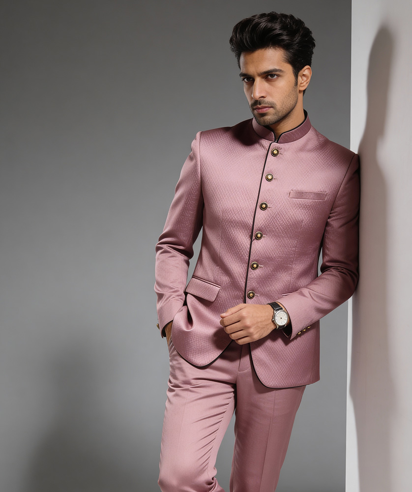 It is a formal Indian jacket with a distinctive high, closed neck collar, blending traditional Indian styles with Western tailoring for a regal and sophisticated look, popular for weddings and formal events.