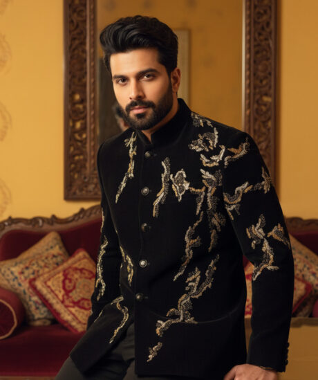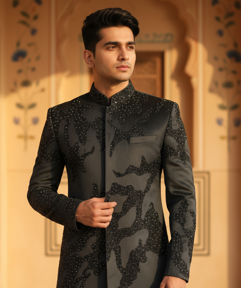 A style of fashion that blends traditional Indian elements with Western designs and silhouettes, featuring opulent embellishments like intricate embroidery, zardozi, sequins, or beads.