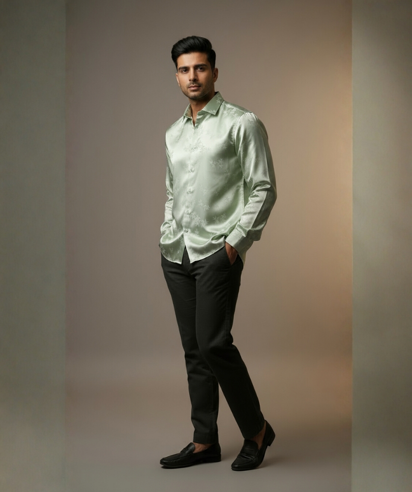 This light green shirt is a men’s satin or silk blend shirt with a smooth, glossy finish. It is a solid-colored, long-sleeved shirt with a spread collar and button closure.