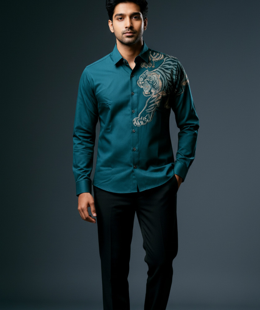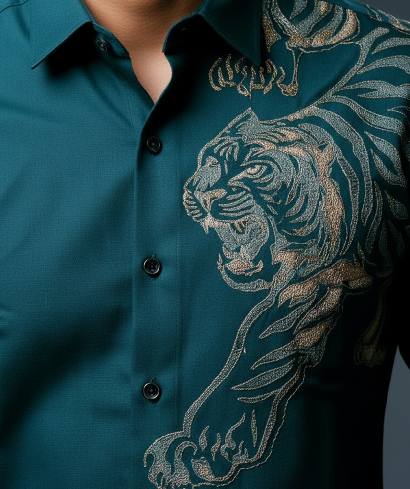 It features a prominent tiger motif, often referred to in product listings as a “Tiger Roar” design. The specific shirt shown appears to be a full-sleeved, collared button-down in a premium fabric like satin cotton, designed for party wear.