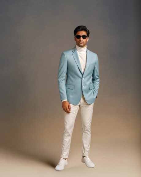 | Brand Name | Bluez | Product Attributes | The fabric has a subtle sheen and It has a contrasting solid black shawl lapel, which is a rounded, continuous lapel style. |